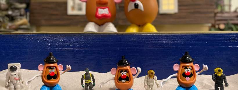 Toy standing by themselves in front of a tree with other toys sitting together in the background